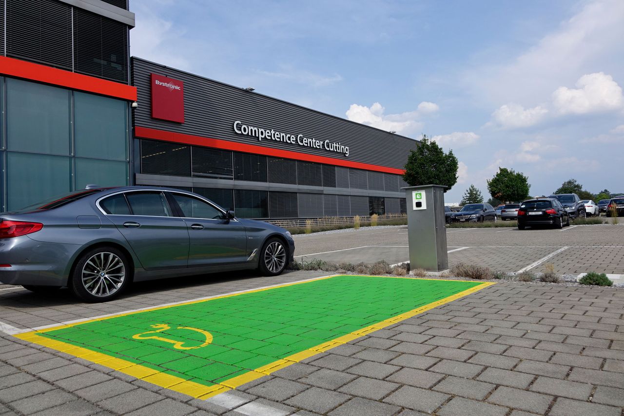 Neu steht auf dem Besucherparkplatz ein E-Parkplatz zur Verfügung. Der grün markierte Parkplatz ist direkt vor dem Empfang der Bystronic. Kunden und Besucher können dort von 6:00 Uhr bis 20:00 Uhr ihre Elektroautos kostenlos laden. Besucher mit einem Elektroauto fahren auf den E-Parkplatz und melden sich danach am Empfang, der die aktiviert. So laden Bystronic Kunden und Besucher kostenlos ihre Elektroautos auf.