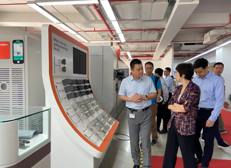 游松博士向市经信委副主任张英女士介绍百超进口激光切割设备