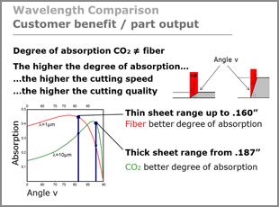 The focused beam of even a 2kW fiber laser demonstrates a 5X greater power density at the focal point when compared with a 4kW CO₂ laser. It also possesses a 2.5X greater absorption characteristic due to the shorter wavelength of the fiber laser. (see Figure 1 and Figure 2).